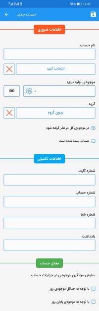 واحد پولی: در مقابل موجودی اولیه امکان انتخاب واحد پولی حساب جدید وجود دارد. توجه داشته باشید پس از ذخیره یا به عبارتی تعریف حساب جدید، امکان تغییر واحد پولی وجود ندارد. واحدهای پولی غیر ریالی در حال حاضر فقط در بخش تراکنش‌ها کاربرد دارد و در بخش‌های دیگر مانند چک، وام، طلب و بدهی قابل استفاده نیستند.